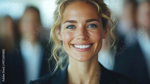 A woman with blonde hair and blue eyes is smiling and looking at the camera. She is wearing a black suit and she is confident and happy