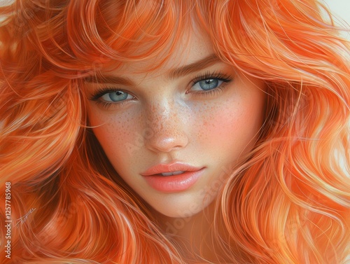 A woman with bright orange hair and blue eyes