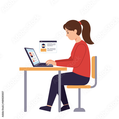 A woman with brown hair in a ponytail is sitting at a desk typing on a laptop with a school window open on the screen