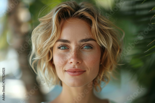 A woman with curly hair is smiling and looking at the camera. She is wearing a shirt. an attractive woman in an office, in the style of muted, earthy tones, , light orange and light indigo