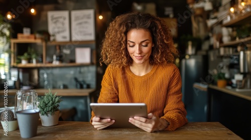 A woman with curly hair sits in a cozy café, engaged with a tablet, wearing an orange sweater, enjoying a warm and inviting ambiance around her.