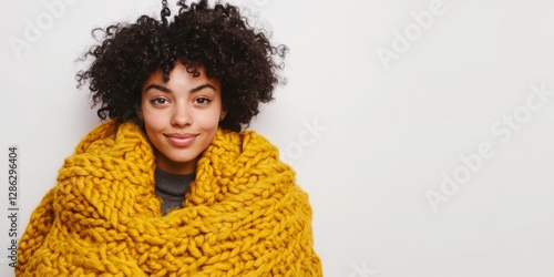 A woman with curly hair wears a yellow scarf around her neck