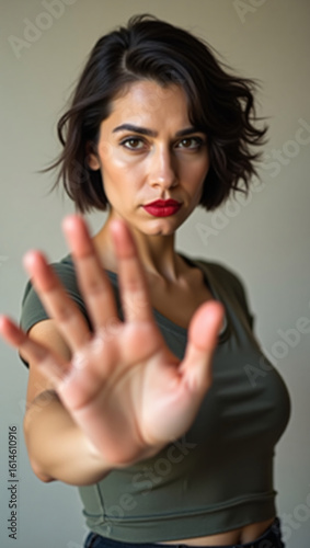 A woman with determined expression extends her hand in a stop gesture, wearing olive green t-shirt and red lipstick