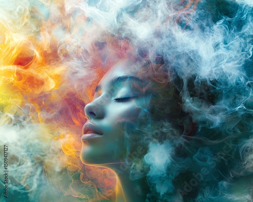 A woman with eyes closed imagines clouds as her hair, blending technology and creativity in a colorful, abstract setting
