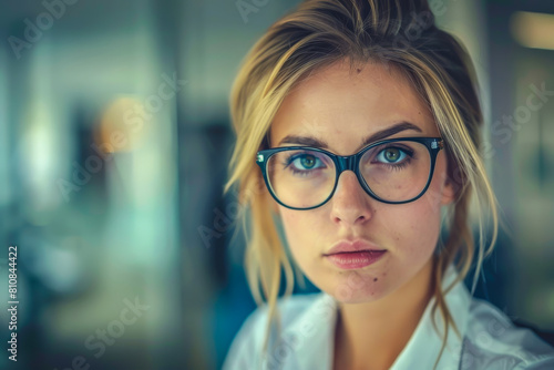 A woman with glasses is looking at the camera