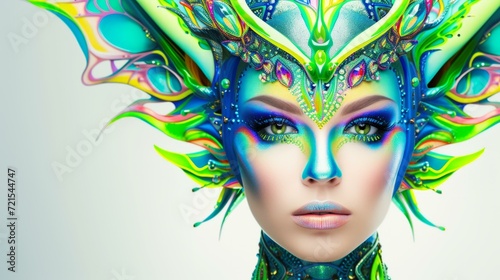 woman, headdress, face paint, green eye, fantasy, surreal, colourful, vibrant, intricate, detailed, ornate, elaborate, costume, make-up, beauty, fashion, art, portrait, photo, digital artwork, illustration, graphic design, modern art, abstract art, expressionism, surrealism, fantasy art