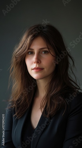 woman, long, brown, hair, wearing, black, jacket, sitting, portrait, face, serious, person, female, front, expression, wall, young, beauty, adult, caucasian, background, model, attractive, white, lady, fashion, pretty, happy, lifestyle, style, natural, cute, isolated, cheerful, smile, brunette, looking, 1, casual attire, modern, studio, skin, confident, youth, closeup