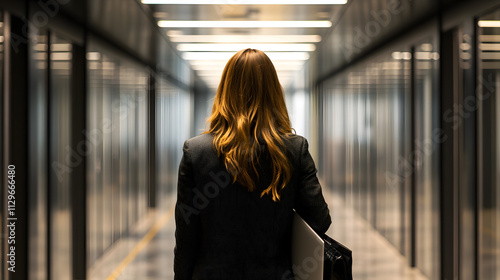 woman, walking, hallway, office, business, professional, career, ambition, laptop, bag, modern, corporate, businesswoman, employee, men at work, success, confident, determined, strong, independent, leadership, management, executive, entrepreneur, future, goal, progress, pathway, corridor, interior, architecture, design, building, light, shadow, backview, long hair, brown hair, briefcase, stylish, elegant, sophisticated, urban, city, workplace