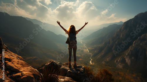 mountain, woman, top, sky, nature, success, freedom, people, adventure, climbing, hiking, rock, sport, person, mountain, peak, landscape, outdoors, happiness, travel, achievement, joy, jump, summer, arms raised, mountain landscape, vale, serene, inspirational, wonder, long hair, majestic, golden hour, dramatic sky, photorealistic, cinematic, breathtaking, scenic, peaceful
