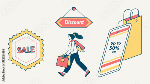 sale, discount, shopping, woman, bag, promotion, retail, offer, deal, bargain, savings, consumer, client, shop, store, commerce, business, marketing, advertising, label, tags, price, reduction, off, percentage, 50, percent, illustration, graphic, design, vector, flat, style, modern, clean, simple, minimalist, concept, activity, lifestyle, seasonal, holiday, event, celebration, buying, purchasing, consumerism
