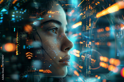 A woman's face on a computer screen with lots of lights and numbers. Futuristic technology concept