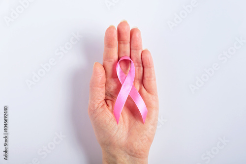 A womans hand gently holding a pink ribbon on a white background, symbolizing solidarity and support for breast cancer patients. Perfect for awareness projects and healthcare messaging.