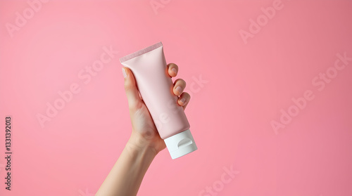 A woman's hand holds a bottle of beauty cream for skin care and healthy treatment