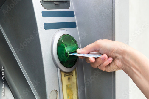 A woman's hand takes out a bank plastic card from an ATM.