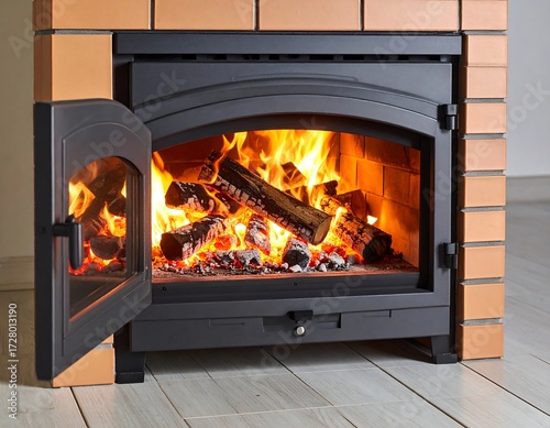 stove, fireplace, wood, fire, burning, flames, log, heat, warmth, cosy, brick, orange, black, metal, glasses, door, interior, home, design, modern, rustic, comfort, energy, efficient, oven, open, view, light, warm, bright, firewood, hot