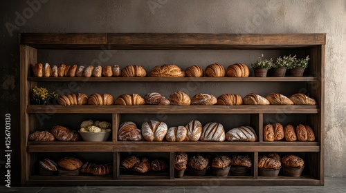 A wooden bakery display filled with croissants, baguettes, and other freshly baked bread. Warm and inviting. Copy space.