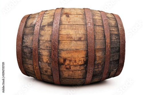 A wooden barrel with metal straps on a white background, suitable for use in still life photography or as a prop in various settings
