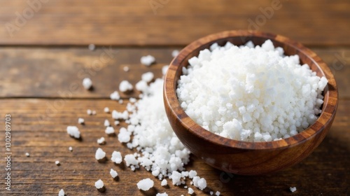 A wooden bowl filled with small white granules sits on a rustic brown wooden surface, some granules scattered nearby.