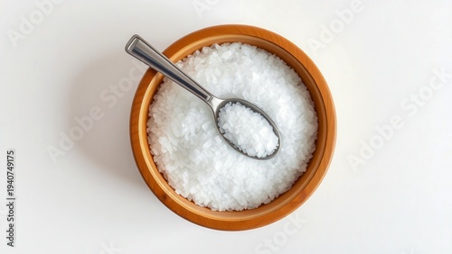 A wooden bowl is filled with snow-white coarse salt. A spoon lies neatly in it. The isolated background emphasizes the purity and naturalness of the product.
