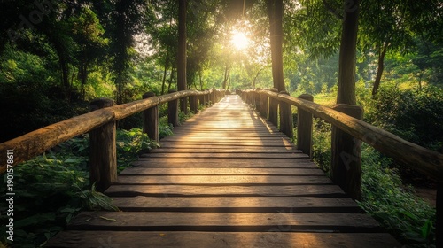 A wooden bridge leading through a lush forest, bathed in the golden light of the setting sun.