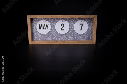 A wooden calendar block showing the date May 27th on a dark black background, save the date or date of an event concept.