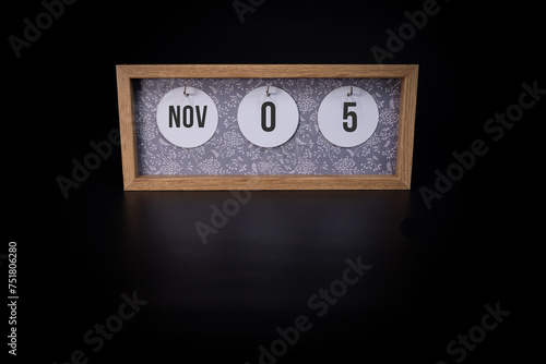 A wooden calendar block showing the date November 5th on a dark black background, save the date or date of event concept