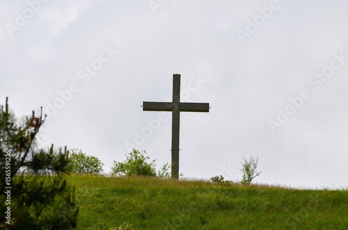 A wooden cross is standing on a hillside in a grassy field. The sky is cloudy, and the cross is the only visible object in the scene