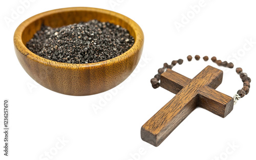 A Wooden Cross Necklace in Reverence Next to a Bowl of Ash Isolated On Transparent Background.