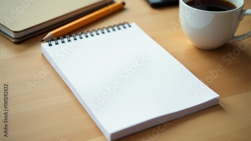 A wooden desk workspace with blank sketchbook, pencil, succulent plant, cup of coffee, and notebooks, perfect for creativity and planning
