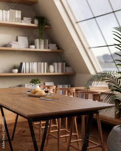 three-dimensional, rendering, illustration, background, interior, indoor, modern, contemporary, minimal, minimalist, cosy, comfortable, trendy, fashionable, furniture, room, no people, beige, brown, home, house, apartment, architecture, warm, scandinavia, nordic, wooden, luxury, elegance, living room, living, lounge, dining table, dining room, eatery, cafes, cafes, table, desk, stool, chair, window, shelf, kitchen