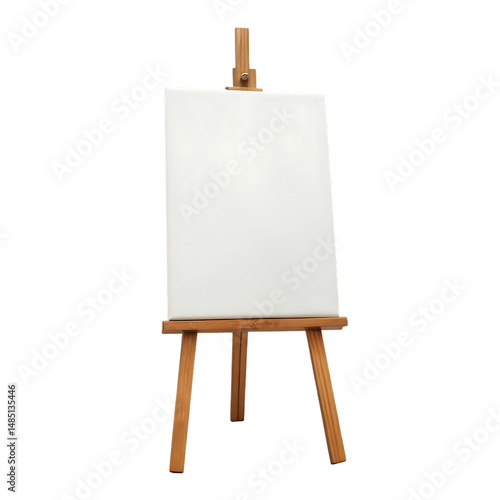 a wooden easel with a white canvas isolated on white background