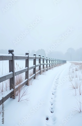 A wooden fence leading into a snowy field with a large empty white area