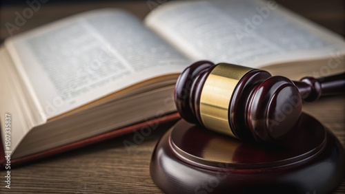 A wooden gavel rests beside an open law book, symbolizing justice and legal proceedings in a professional setting.