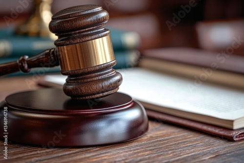 A wooden gavel rests on a sound block near legal books, symbolizing justice and the legal system.