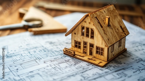 A wooden house model on construction blueprints, symbolizing architecture and design concepts in building and home planning.