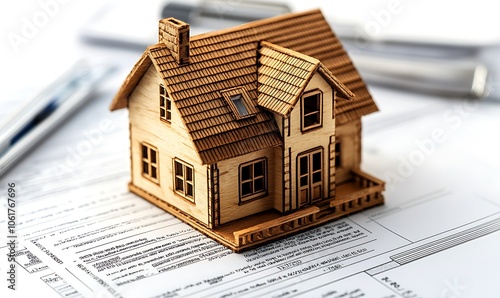 A wooden house model on top of paperwork, symbolizing real estate and home ownership.