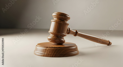A wooden judge's gavel and sound block resting on a plain surface with a shallow depth of field.