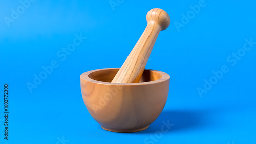 A wooden mortar and pestle set against a vibrant blue backdrop in a studio setting with soft lighting
