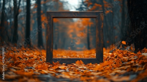 A wooden picture frame sits amidst autumn leaves on the ground
