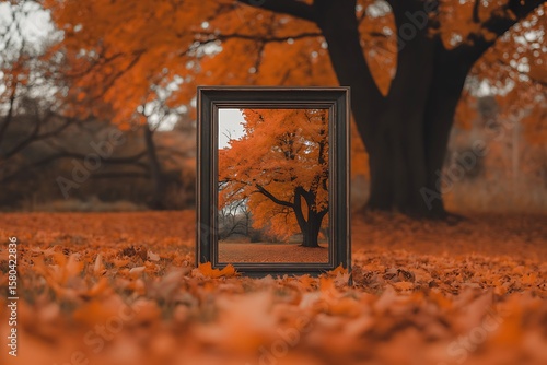 A wooden picture frame stands in a field of fallen orange autumn leaves, reflecting a vibrant maple tree in its glass
