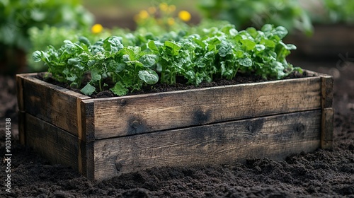 A wooden raised garden bed filled with freshly sprouted green leafy vegetables sits in a garden setting.