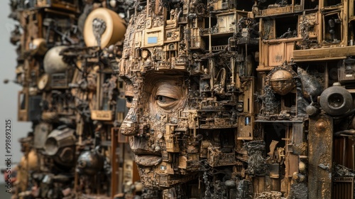 sculpture, wood, face, human, eye, nose, mouth, building, miniature, building, object, object, detail, detail, art, artwork, artist, craft, craftsmanship, intricate, textured, abstract, brown, black, grey, light, dark, macro, contemporary, modern, surreal, realistic, imaginative, installation, exhibition, gallery, museum, culture, creativity, transport, iron, vintage, steam, transportation, car, vehicle, technology, factory, rust-eaten
