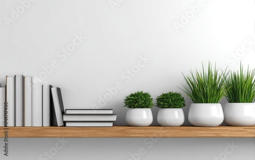 A wooden shelf displays a collection of books and small potted plants against a blank white wall, evoking a calm and organized home decor aesthetic.