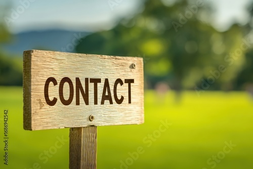 A wooden sign reads "CONTACT" against a blurred green background, suggesting an inviting or informational setting in nature.
