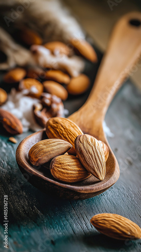 A wooden spoon overflowing with fresh almonds, showcasing their natural texture and color. Healthy snack option.