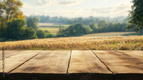A wooden surface in the foreground with a blurred landscape of fields and trees in the background.