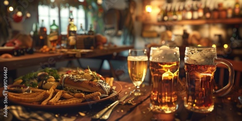 A wooden table set with plates of food and glasses of beer, perfect for outdoor gatherings or parties