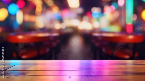 A wooden table with a colorful bokeh background, featuring a mix of vibrant lights and colors.