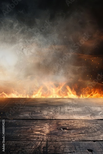 A wooden table with a lot of fire and smoke on it. The fire is burning brightly and the smoke is thick and dark. Scene is intense and dramatic