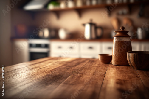 a wooden tabletop against a background of a kitchen interior that is fuzzy
